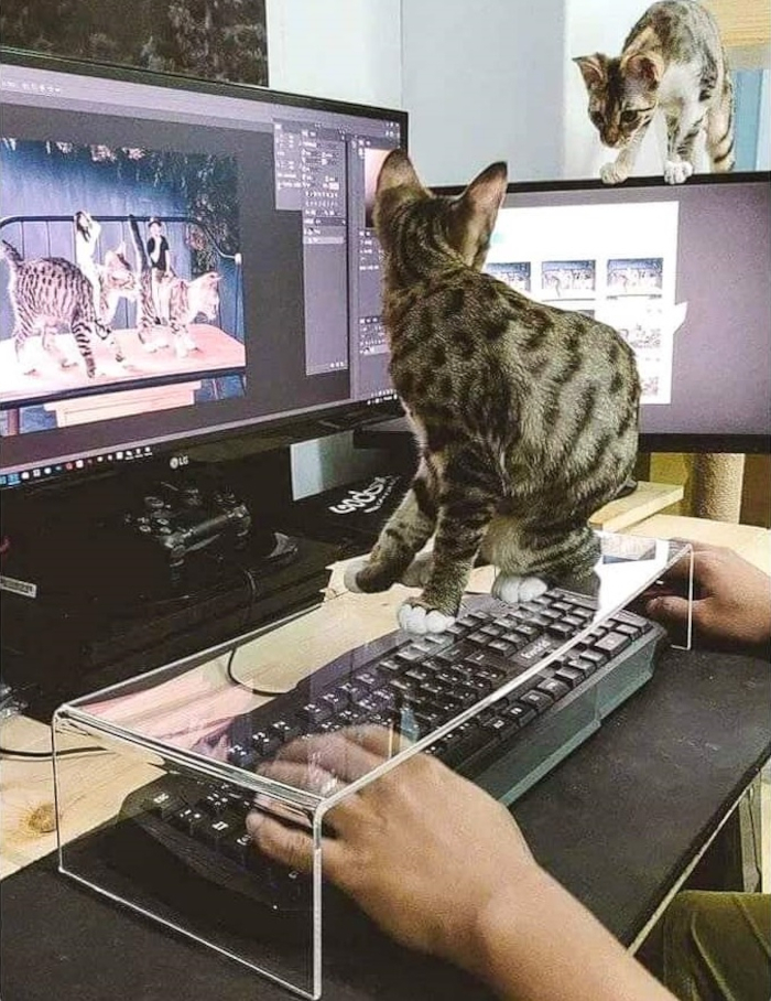 8. Van két macskám, akik folyton körülöttem és a billentyűzeten sündörögnek, amikor dolgozni próbálok. Hogy ne zavarjanak, és ők is jól érezhessék magukat, elhelyeztem egy átlátszó állványt a billentyűzet fölé.