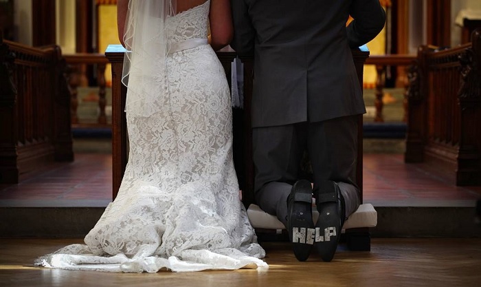 2. Nem értettem, hogy a vendégek miért kuncognak az esküvőnkön, aztán a fotókról kiderült, hogy a férjem cipőtalpra írt üzenettel próbált segítséget kérni tőlük.