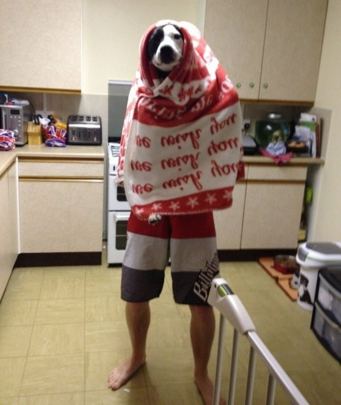 8. A nappaliban voltam és meghallottam, hogy a konyhában a férjem azt hajtogatja a kutyánknak, hogy maradjon nyugton. Bementem megnézni, hogy mégis mit csinálnak, és ez a látvány fogadott: