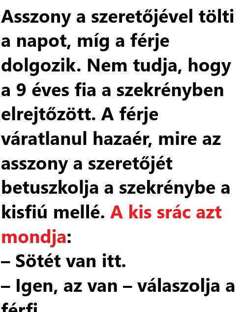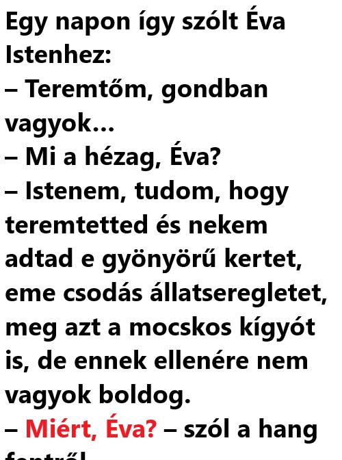 Egy napon így szólt Éva Istenhez: – Teremtőm, gondban vagyok… – Mi a hézag, Éva? – Istenem, tudom, hogy teremtetted és nekem adtad e gyönyörű kertet, eme csodás állatseregletet, meg azt a mocskos kígyót is, de ennek ellenére nem vagyok…